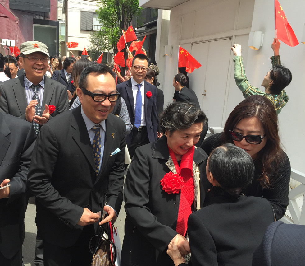 2015421日,日本东京“日中友好会馆美术馆”的画展开幕现场,日本前首相鸠山由纪夫(左二)与协会名誉会长赵青(右二)、协会秘书长刘彤(右一)、NPO法人国际文化交流机构负责人黄实(左一)合影留念
